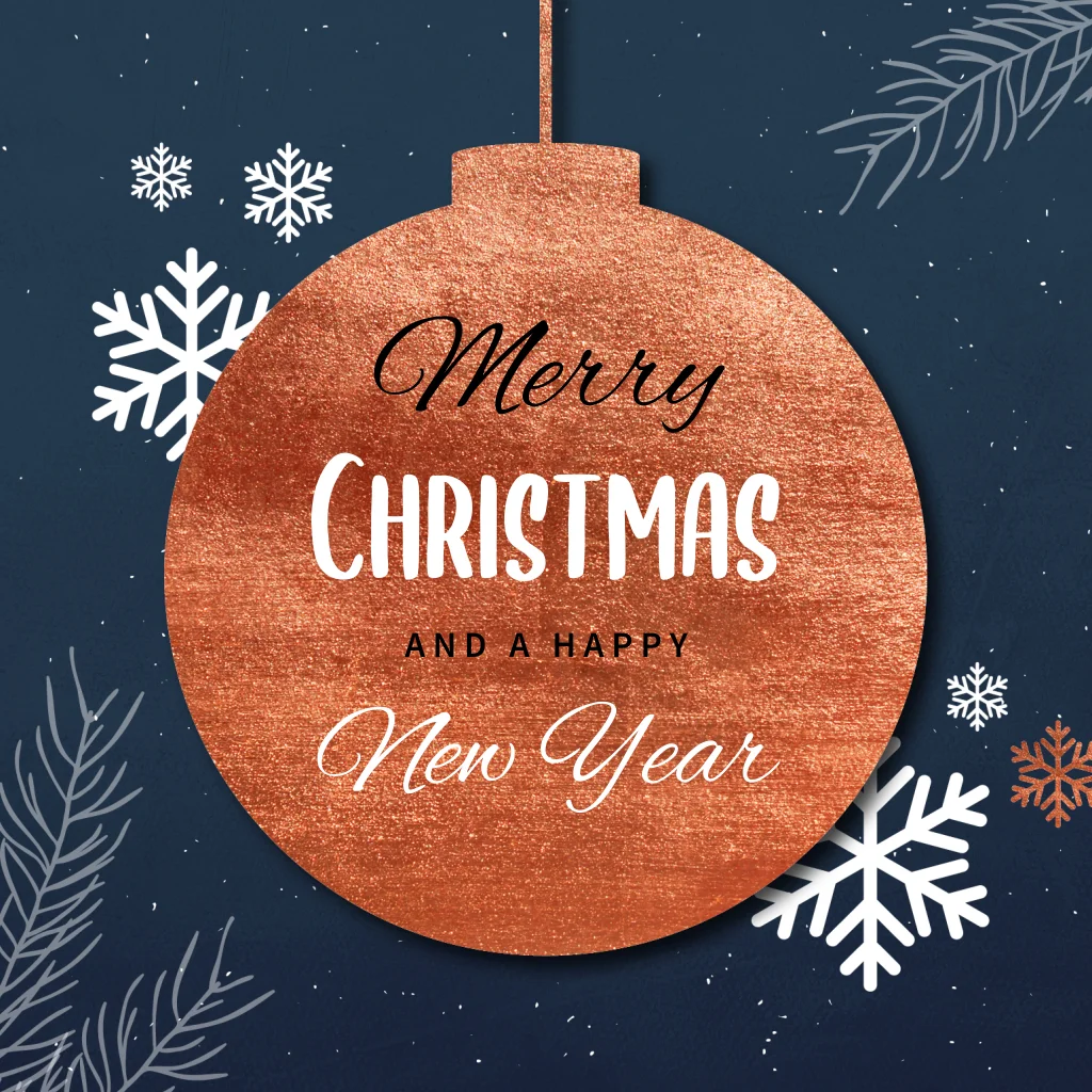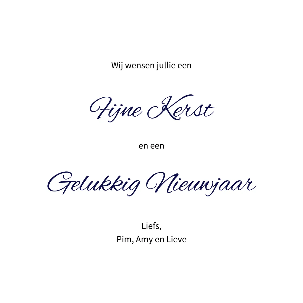 Een mooie, donkerblauwe kerstkaart met daarop een rosékleurige kerstbal erop. De ijskristallen en dennentakjes maken het ontwerp tot een winters geheel. Aan de binnenzijde is ruimte voor een kerstgroet aan vrienden en familie. Pas dit ontwerp eenvoudig zelf aan in onze ontwerptool.