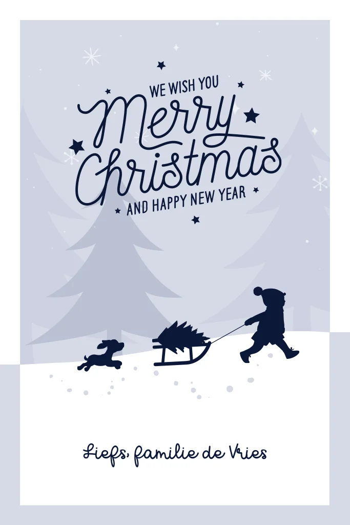 Vrolijke kerstkaart met winters landschap in blauw. Een jongentje in silhouet loopt met slee met daarop een kerstboom door de sneeuw. Een hondje rent ver rolijk achteraan. Pas de kaart aan met de editor.