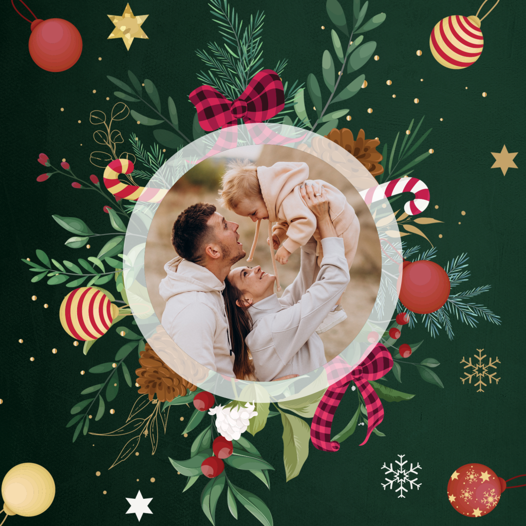 Donkergroene kerstkaart met foto, kersttakken en kerstballen
