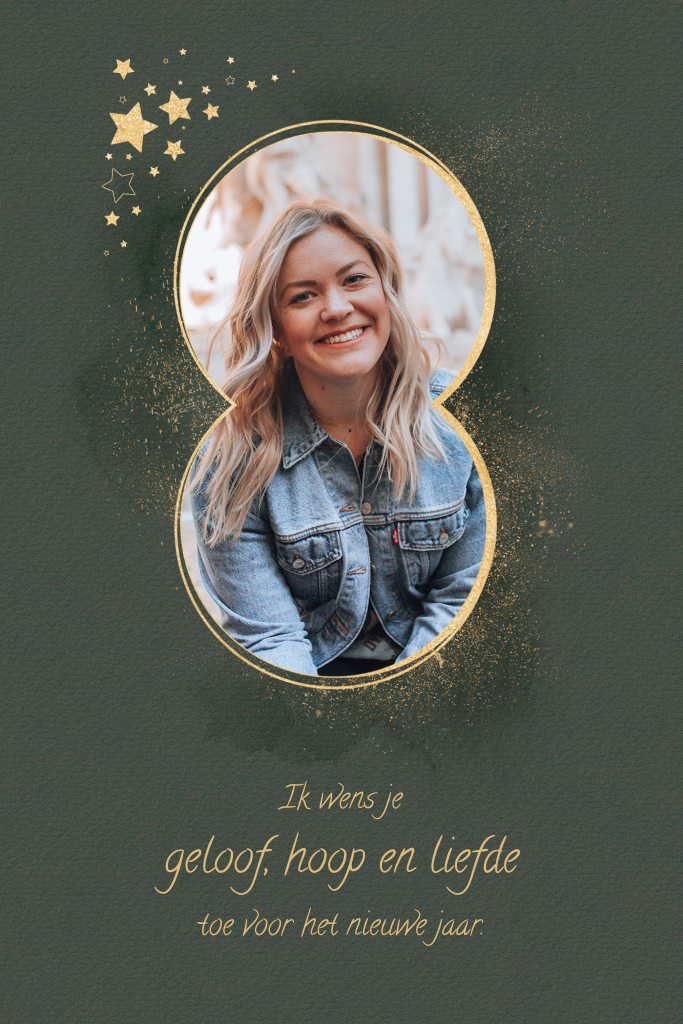 Trendy donkergroene kerstkaart met ruimte voor een mooie foto. De foto staat in een kader van een dubbele cirkel en in de hoek staan goudkleurige sterren. Op de achterzijde is er ruimte voor de tekst. Pas de kaart naar wens aan in de designtool.