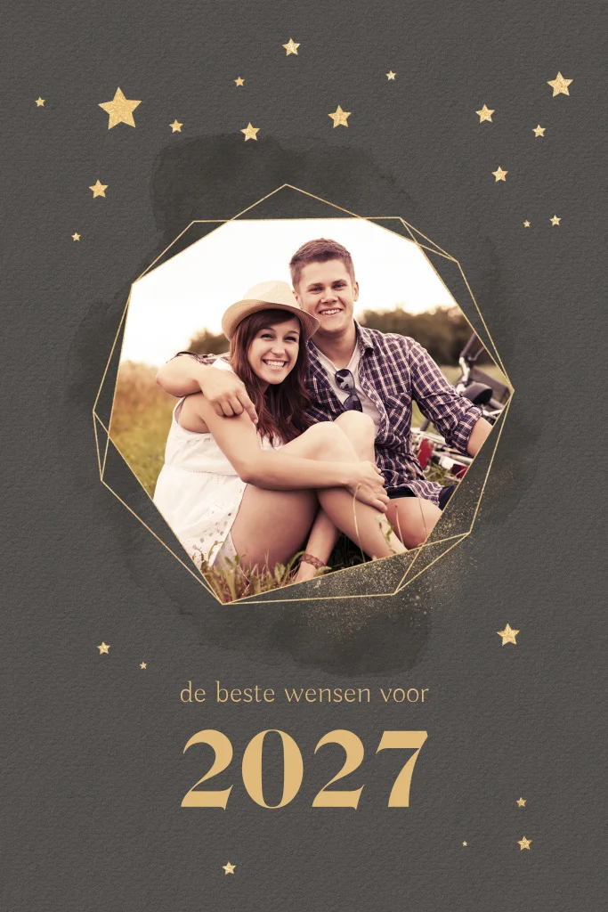 Hippe kerstkaart in donkerbruin met ruimte voor een mooie foto. De foto staat in een hip grafisch kader en is omgeven met goudkleurige sterren. Op de achterzijde is er ruimte voor de tekst. Pas de kaart naar wens aan in de editor.