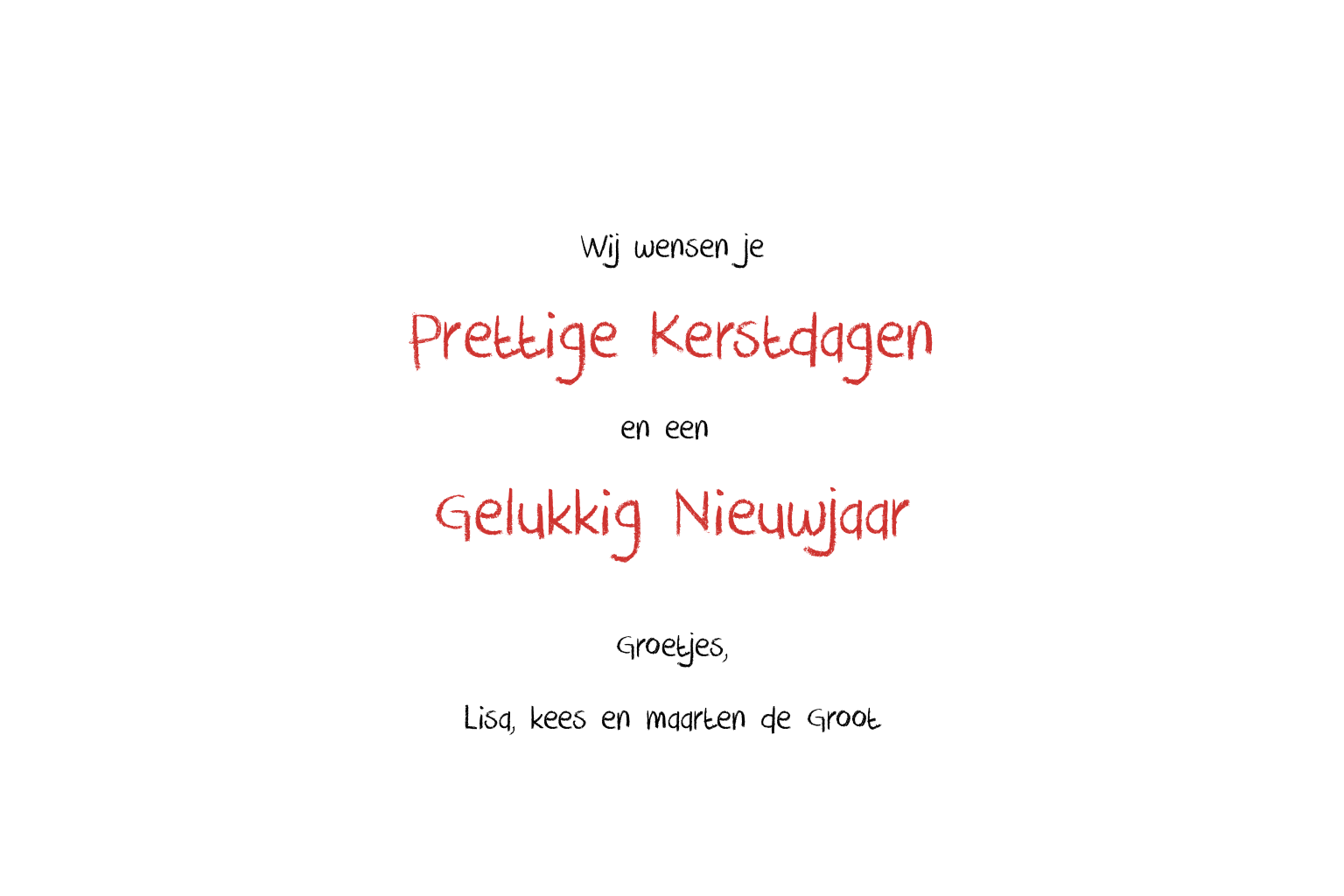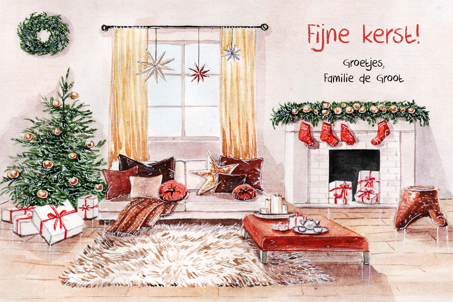 Mooie, getekende kerstkaart met een kijkje in een in kerstsfeer ingerichte huiskamer. Kerstboom met pakjes eronder, kerststerren aan het raam en een kerstkrans boven de schouw. Stuur deze gezellige kerstkaart rond aan vrienden en familie.
