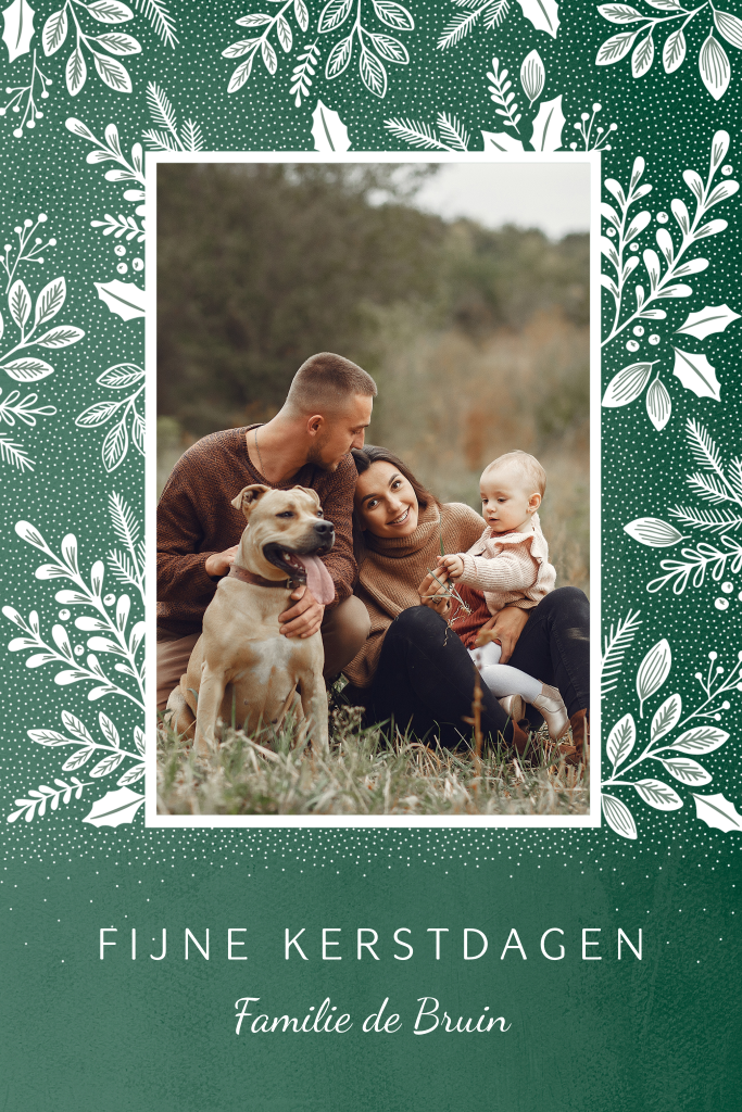 Ben je op zoek naar een mooie kerstkaart met veel ruimte voor een eigen foto van jullie gezin? Dan is deze donkergroene kaart perfect! Naast de foto is de kaart volledige in kerstsfeer. De tekst voorop staat in goudfolie!