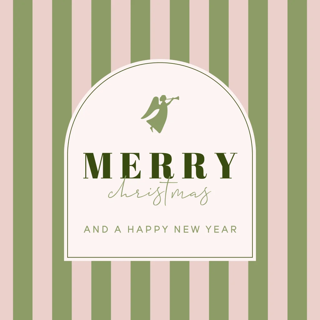 Stijlvolle kerstkaart met roze en groene strepen en een trompet spelend engeltje. De rustige kleuren en klassieke typografie geven de kaart een tijdloze uitstraling. Perfect om warme wensen voor de feestdagen en het nieuwe jaar te versturen. Voeg eenvoudig je eigen tekst toe in onze online editor en maak de kaart helemaal persoonlijk.
