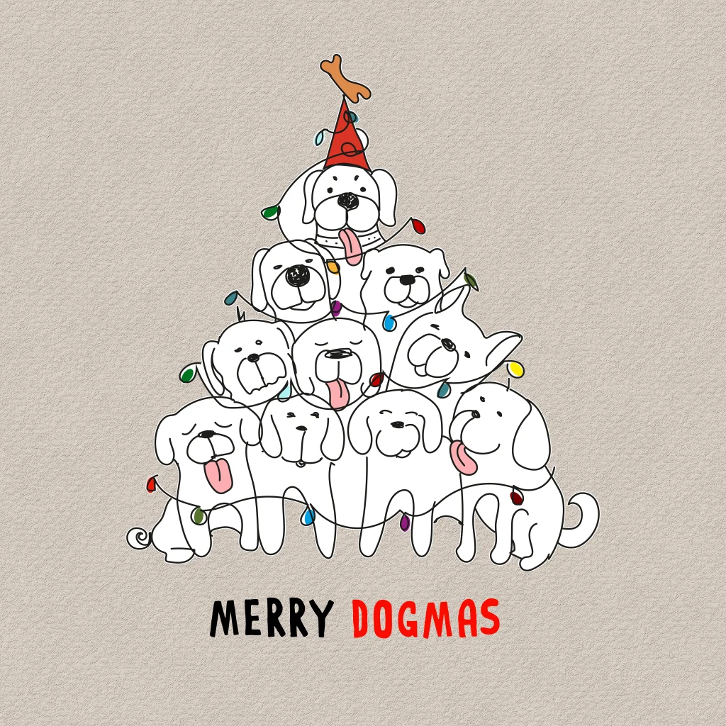 Een speelse kerstkaart met een stapel honden in de vorm van een kerstboom, compleet met kerstlichtjes, feesthoed en bot als piek. Met de tekst “Merry Dogmas” brengt deze kaart een humoristische en originele twist.