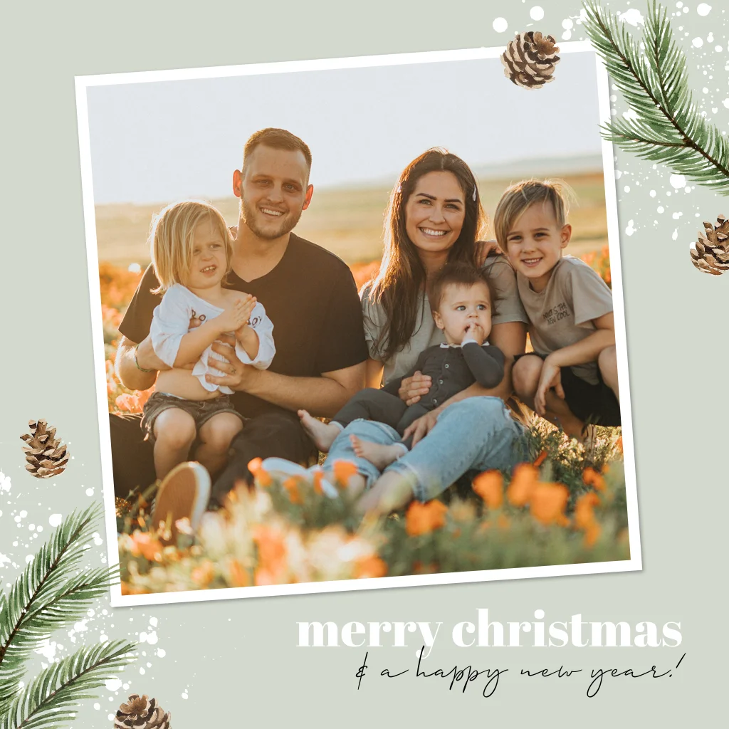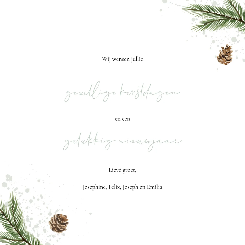 Wil je een leuke kerstkaart versturen met daarop een foto van je gezin? Ga dan voor dit lichtgroene ontwerp met getekende dennentakjes en dennenappels en grote foto. De spetters maken het ontwerp helemaal af. De binnenzijde is versierd met dezelfde illustraties en spetters.