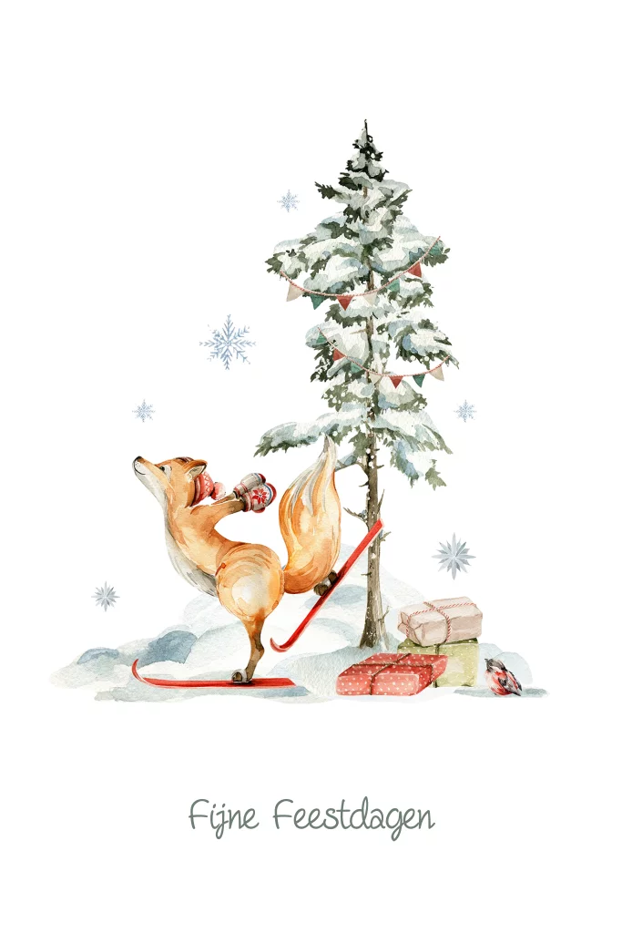 Vrolijke kerstkaart in aquarelstijl met een vos op ski's, die een kerstbal aan een met sneeuw bedekte boom hangt. De vos draagt rode wanten en een sjaal, terwijl onder de boom ingepakte cadeaus liggen. Rechts zit een roodborstje in de sneeuw, en de boom is versierd met vlampjes. Sneeuwvlokken dwarrelen op de achtergrond, en onderaan staat de tekst "Fijne Feestdagen" in een speels lettertype, wat je zelf kunt bewerken met de editor.