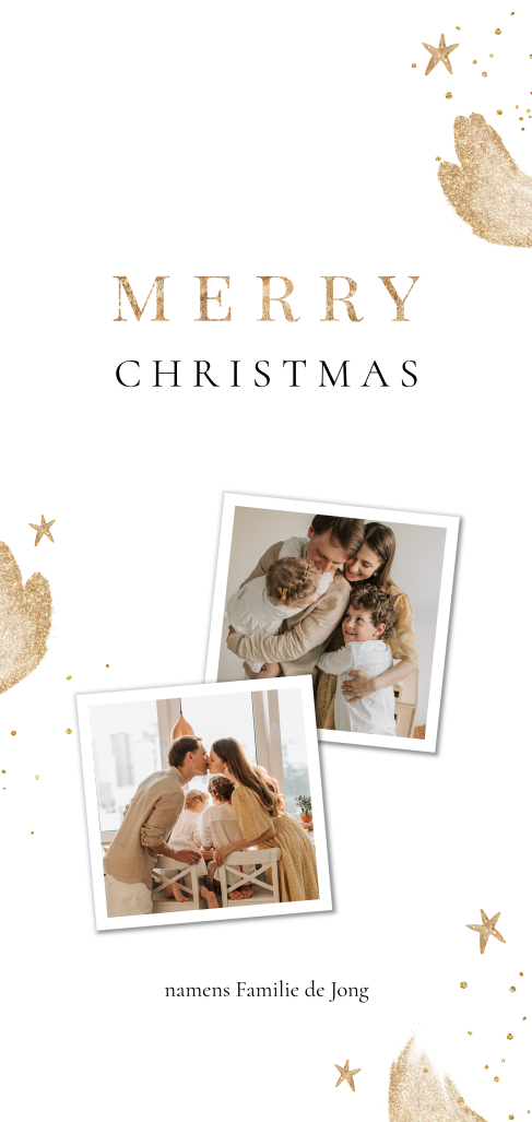 Op zoek naar een hippe kerstkaart om al je naasten een fijne kerst en gelukkig nieuwjaar mee toe te wensen? Ga voor dit trendy kaartje met goudkleurige spetters, sterren en verfvegen. Op de voorzijde is ruimte voor twee eigen foto's en op de achterkant kun je een eigen kerstgroet plaatsen.