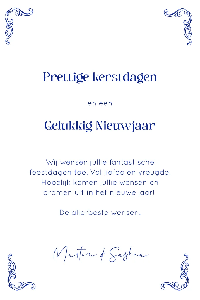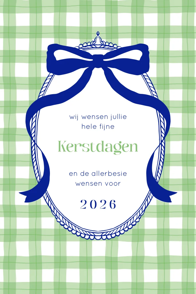 Sfeervolle kerstkaart met een zachtgroen ruitpatroon en klassiek blauw lint. De combinatie van frisse kleuren en sierlijke lettertype geeft de kaart een moderne maar traditionele uitstraling. Voeg eenvoudig je eigen namen of persoonlijke wens toe in de editor voor een stijlvolle kerstgroet.