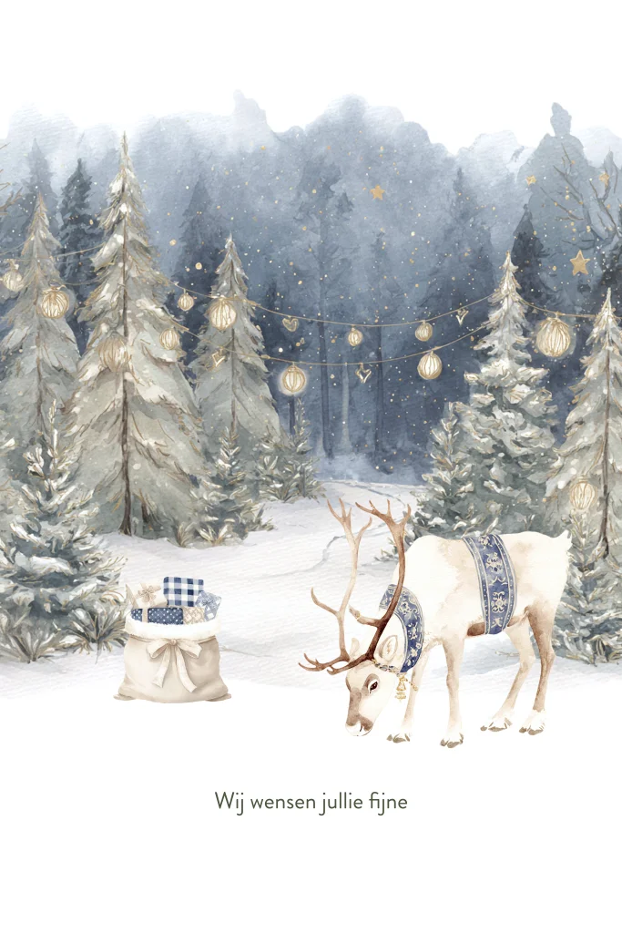 Sfeervolle kerstkaart met een rendier in een winterbos, versierd met gouden lichtjes en subtiele sterretjes. De aquarelstijl en blauw-gouden kleurencombinatie geven de kaart een luxe en serene uitstraling. Perfect om een warme kerstgroet te versturen. Tekst en details eenvoudig aan te passen in onze online editor.