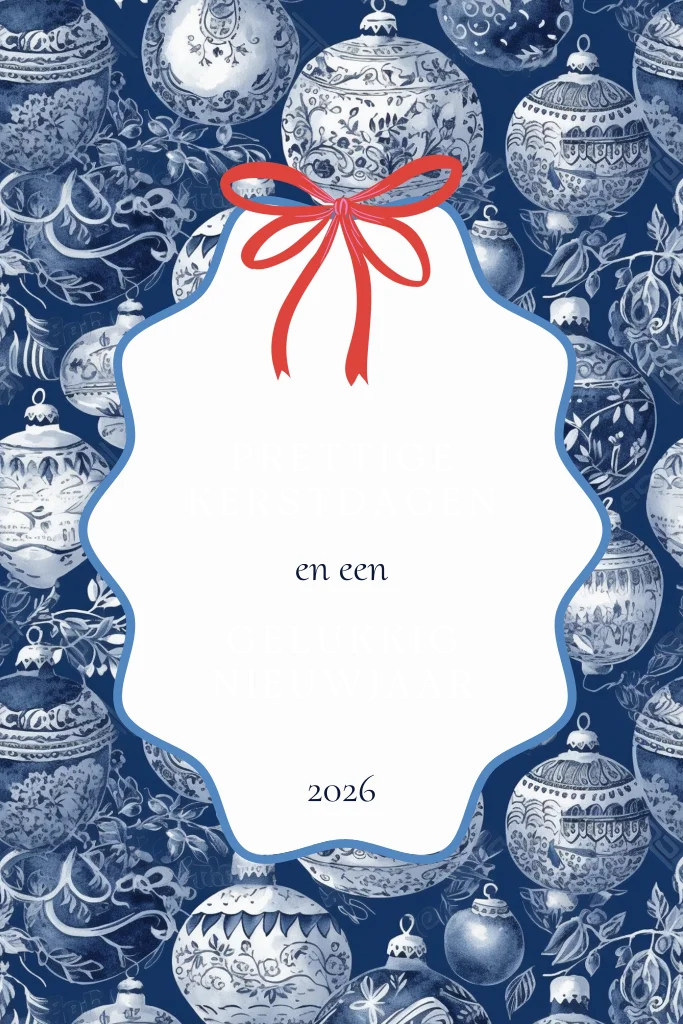 Stijlvolle kerstkaart met Delfts blauwe kerstballen op een diepblauwe achtergrond en een rode strik. Open het ontwerp in de designtool en plaats eenvoudig je eigen tekst.