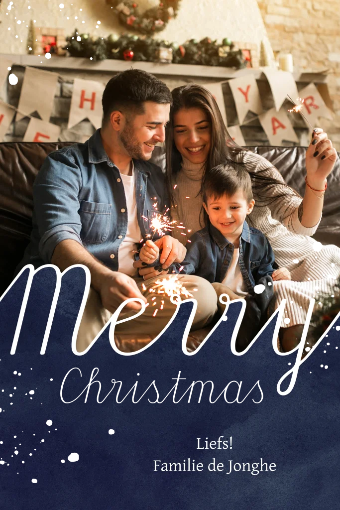 Blauwe kerstkaart met grote foto en koperfolie spetters