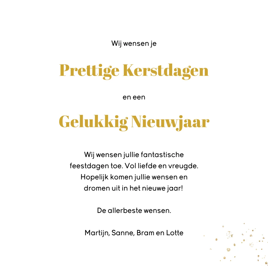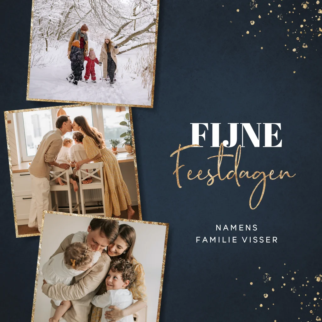 Chique kerstkaart in diepblauw met goudaccenten en ruimte voor drie favoriete familiefoto’s. De combinatie van luxe en warmte maakt deze kaart ideaal om stijlvol fijne feestdagen te wensen namens jullie gezin.