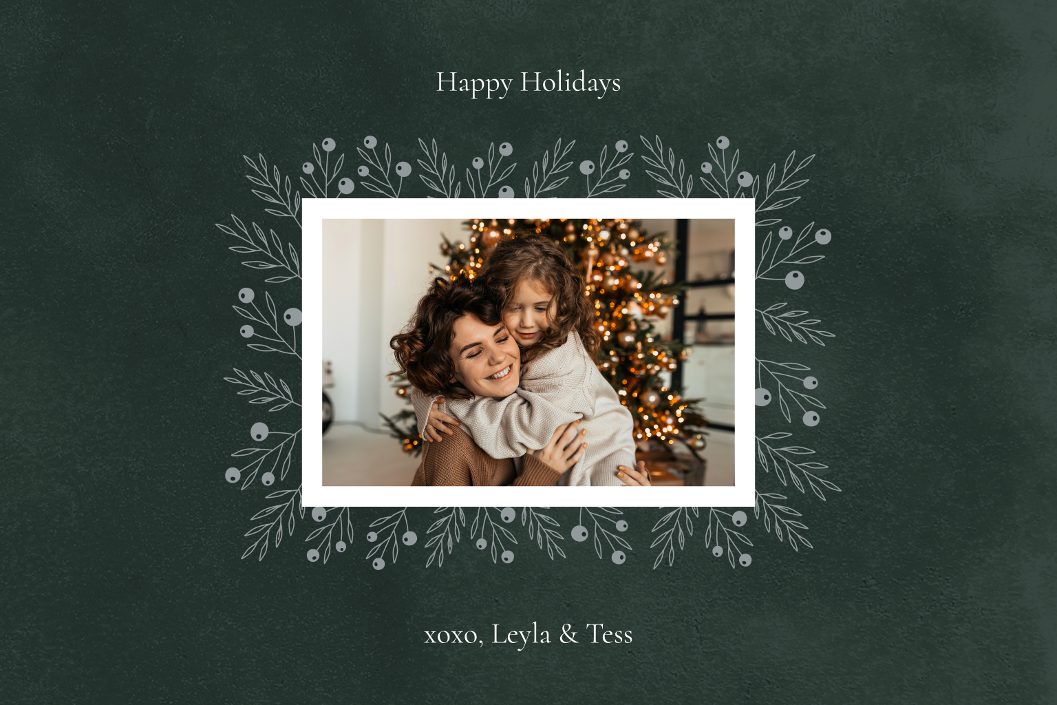 Een eenvoudig, maar stijlvol kerstkaartje met ronde hoeken en een fotokader van subtiele takjes en besjes. Plaats een eigen foto van je gezin, huisdier of herinnering in het fotokader om deze kerstgroet te personaliseren. Op de achterzijde is ruimte voor een kerstwens aan alle vrienden en familie.