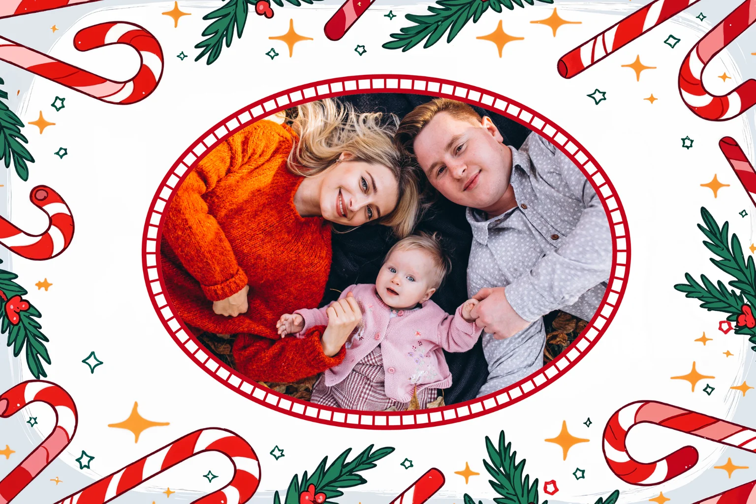 Breng jullie kerstgroet in vrolijke stijl met deze feestelijke kerstkaart vol rood-witte snoepstokjes, kerstgroen en gouden sterretjes. Voeg eenvoudig jullie eigen foto toe in het ovale kader en pas de tekst aan in onze online editor. Zo maak je in een handomdraai een persoonlijke kerstkaart.