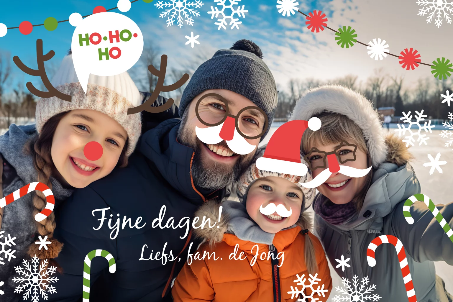 Op zoek naar een grappige kerstkaart voor vrienden en familie? Verstuur deze originele kaart met eigen foto en leuke kerst verkleed elementen. Kleed de foto aan met kerstmutsen, slingers, rendier gewei en meer. Maak je eigen persoonlijke kerstkaart om iedereen een gezellige kerst toe te wensen.