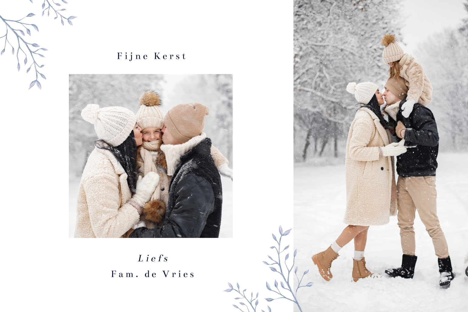 Een mooie kerstkaart met ruimte voor twee foto's, ijsblauwe takjes en klassieke typografie in donkerblauw. Met subtiele typografie kun je een kerstgroet op de voor- en achterzijde plaatsen. Op de achterzijde komen de takjes in een zachte ijsblauwe kleur terug. Personaliseer dit ontwerp in onze handige editor.