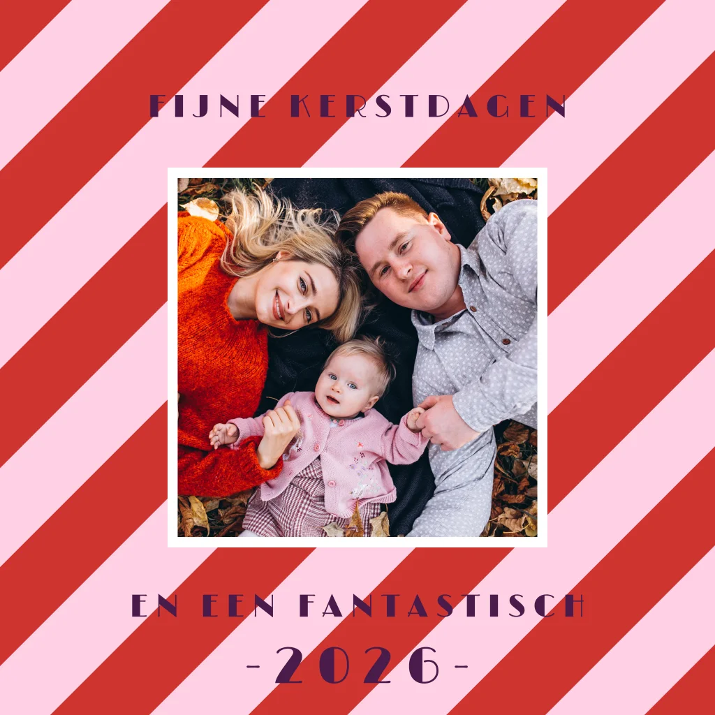 Hippe kerstkaart met roze-rode strepen en eigen foto