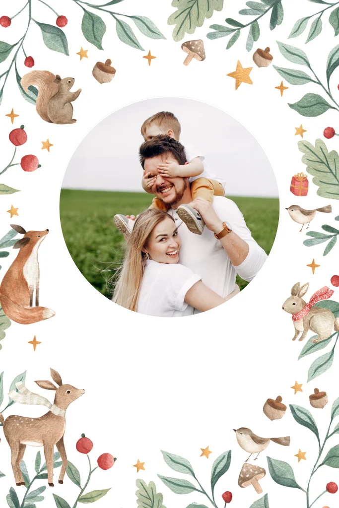 Maak deze kerstkaart extra persoonlijk door je eigen foto toe te voegen in het speelse ontwerp met bosdieren. Het frame is versierd met winterse illustraties van vosjes, hertjes, konijnen, eekhoorns en besjes, wat zorgt voor een warme en gezellige uitstraling. Ideaal om familie, vrienden of relaties op een originele manier fijne feestdagen te wensen. Upload eenvoudig je eigen foto in de editor en creëer een unieke, persoonlijke kerstkaart.