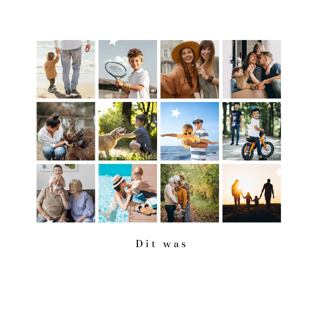 Kerstkaart met foto jaaroverzicht en gouden sterren