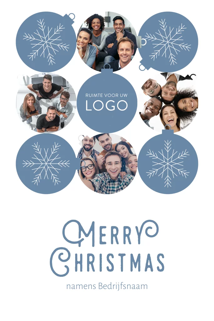 Deze kerstkaart heeft een ontwerp met negen kerstballen, verdeeld in een 3x3 raster. De vier hoeken bevatten lichtblauwe kerstballen met een sneeuwvlok. In de andere vier kerstballen, die zich in een kruisvorm bevinden (boven, onder, links en rechts van het midden), kunnen eigen foto's worden geüpload, zoals foto's van medewerkers of andere afbeeldingen. Het centrale, middelste gebied is gereserveerd voor het bedrijfslogo.