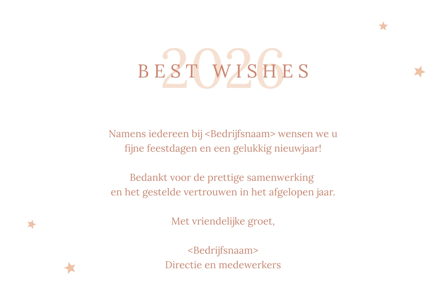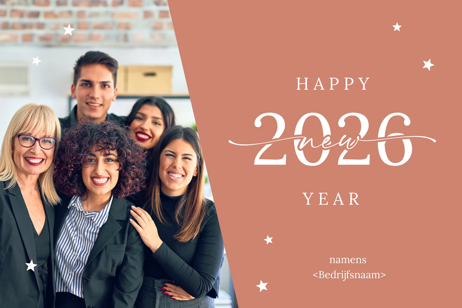 Stuur jouw nieuwjaarswensen voor 2026 op een persoonlijke manier met deze stijlvolle zakelijke kerstkaart. Het ontwerp combineert warme terrakleur met ruimte voor een eigen foto van je team of bedrijf. De tekst "Happy New Year 2026" is op een speelse vormgegeven. Pas de kaart eenvoudig aan in onze editor en voeg je eigen bedrijfsnaam toe om de kaart volledig te personaliseren. Bestel een drukproef als je klaar bent om de kaart in het echt te zien.