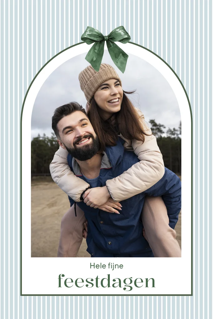 Stijlvolle kerstkaart met een chique boogvormig fotokader en een satijnlook strik bovenaan. De verticale zachtblauwe strepen geven de kaart een warme uitstraling. Perfect om familie en vrienden fijne feestdagen te wensen in een natuurlijke, moderne stijl. Voeg eenvoudig jullie eigen foto en tekst toe in de online editor en maak de kaart persoonlijk.