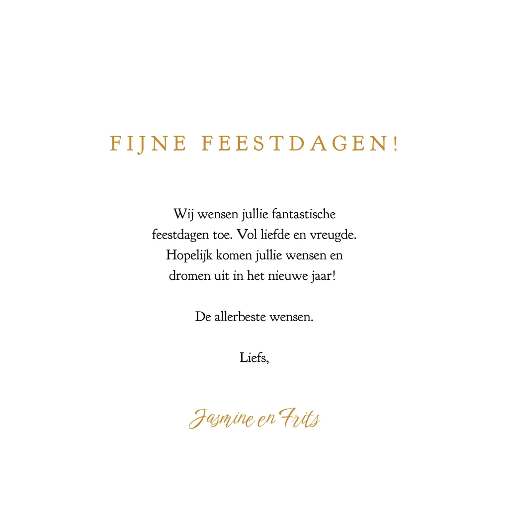 Kerstkaart met een gouden rand van dennetakjes en sterretjes. In het midden is ruimte voor jullie eigen foto en persoonlijke kerstwens. De combinatie van wit en goud geeft de kaart een chique uitstraling. Voeg eenvoudig jullie eigen foto en tekst toe in de online editor en verras familie en vrienden met een luxe kerstgroet.
