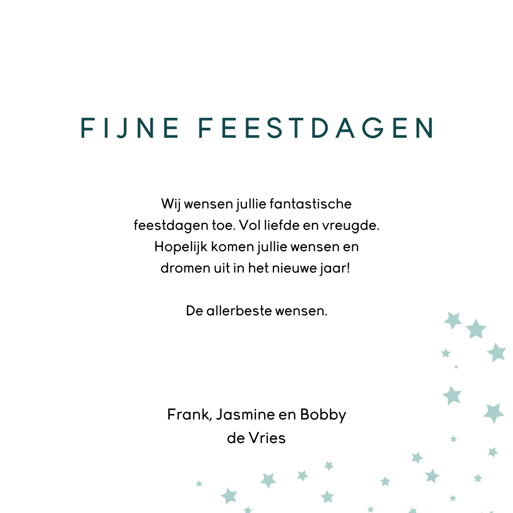 Strakke en moderne kerstkaart met diagonale groene strepen als achtergrond en ruimte voor een grote persoonlijke foto. De sterren zijn gedrukt met goudfolie. Personaliseer de tekst en voeg jullie eigen foto toe in onze online editor voor een unieke kerstkaart.