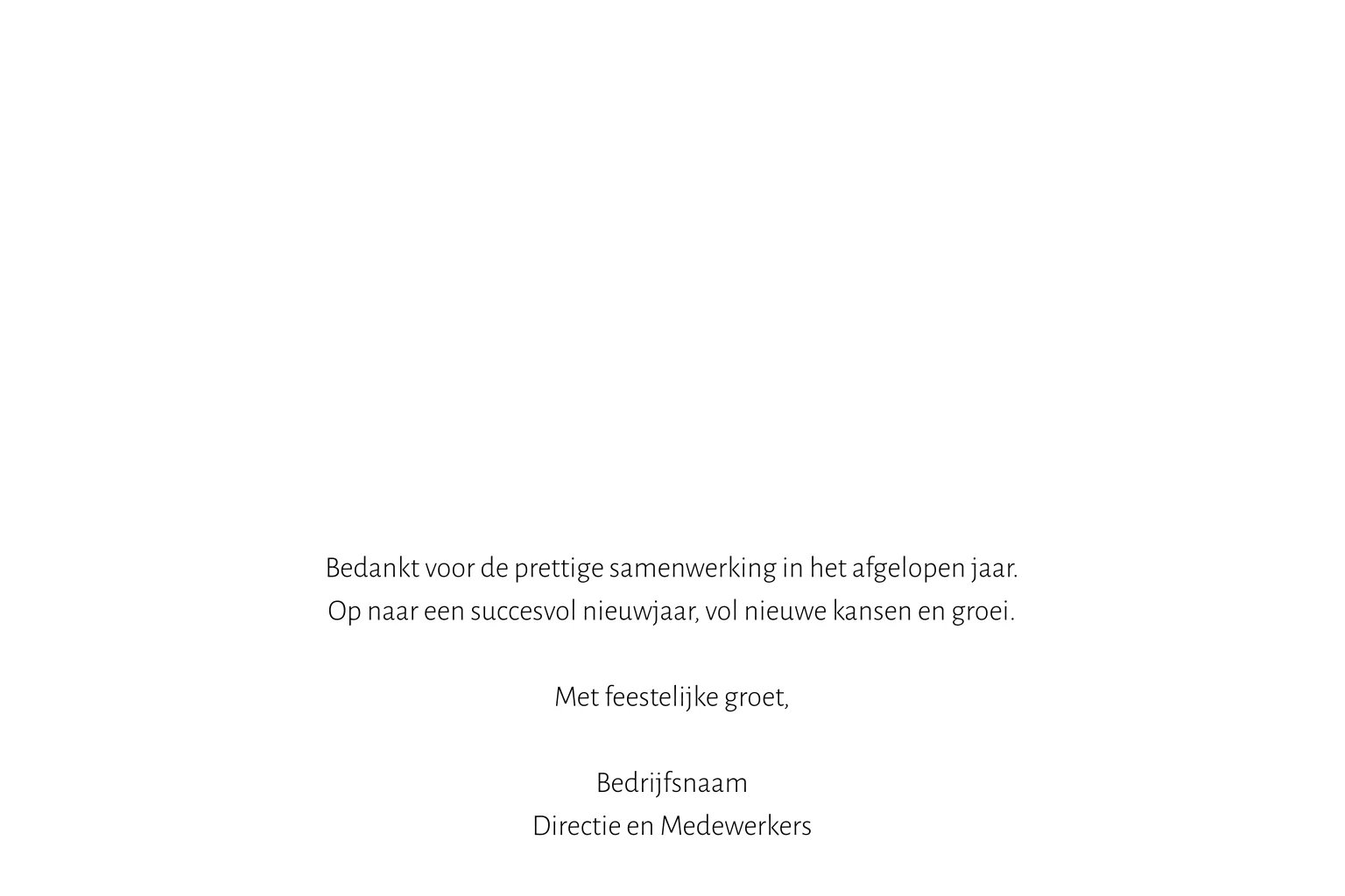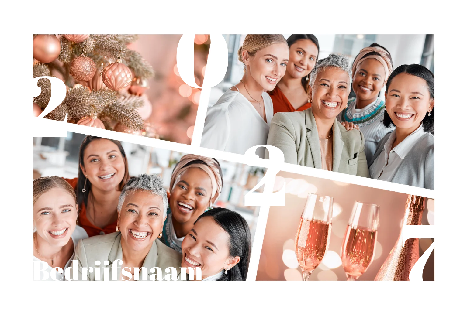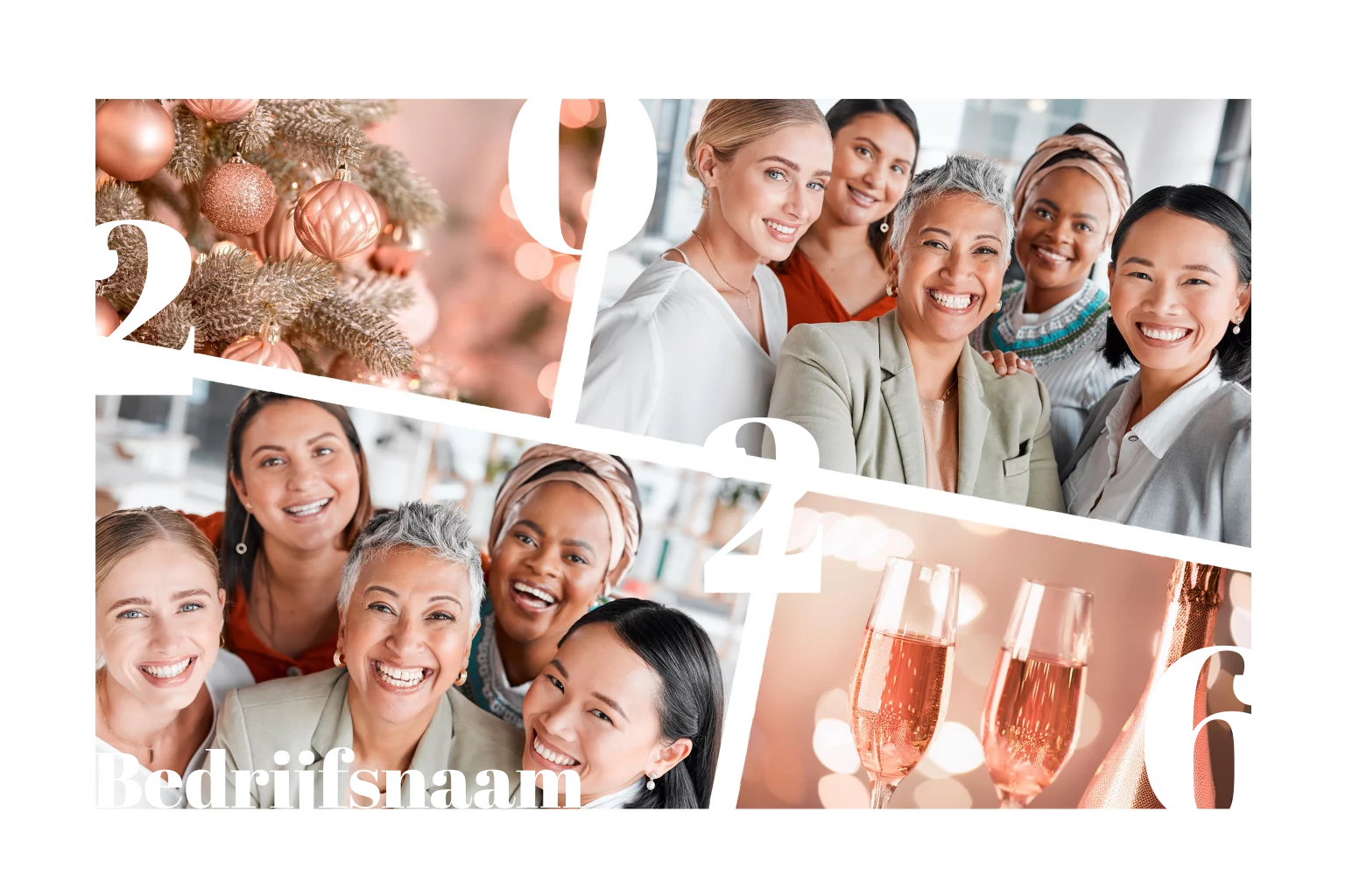 Plaats uw eigen foto's op dit wit met roségouden ontwerp en verstuur een persoonlijke kerstgroet naar al uw zakelijke contacten. In glimmend roségoudfolie komt uw bedrijfsnaam en het jaartal op de voorzijde te staan. De kaart is verder versierd met folie spetters en sfeervolle beelden van een kerstboom en champagne. Geef uw eigen draai aan dit warme kerstkaartje in onze editor en bestel een proefdruk.