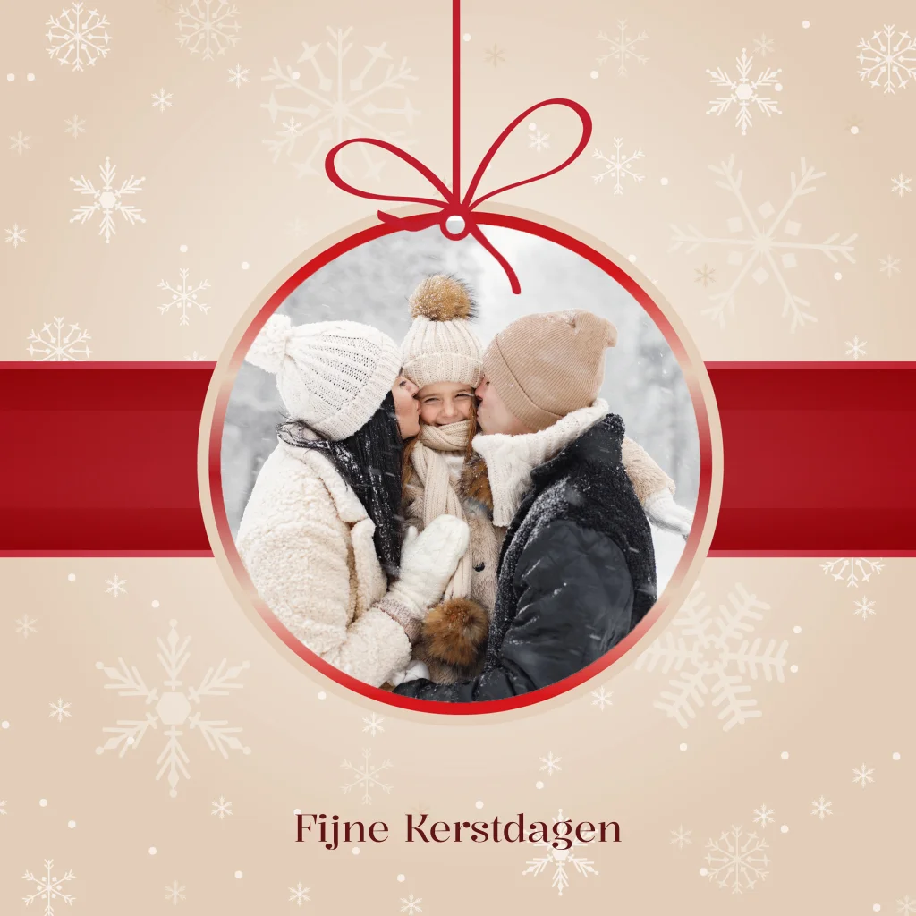 Warme en klassieke kerstkaart met eigen foto in een rode kerstbal, omringd door subtiele sneeuwvlokken. De zachte beige achtergrond en het rode lint geven de kaart een moderne look-and-feel. Pas eenvoudig online aan met de kaartenmaker.