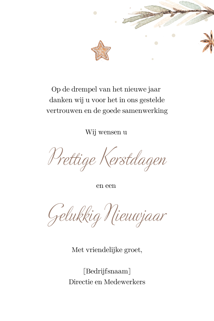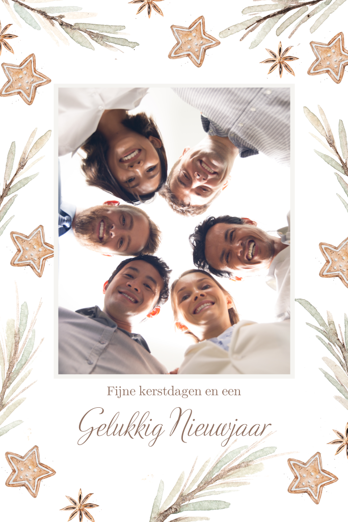 Vrolijke kerstgroet op een staande kaart, inclusief een foto van bijvoorbeeld jullie fantastische team. De afbeelding wordt omringd door charmante waterverf illustraties van dennentakken en stervormige koekjes. Personaliseer de kaart moeiteloos met behulp van de ontwerptool en vergeet niet om een drukproef aan te vragen.