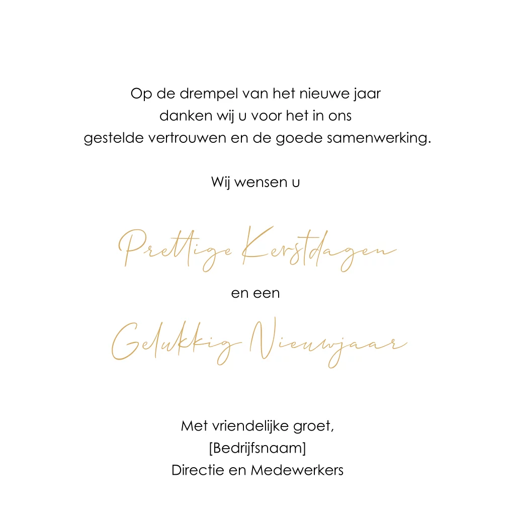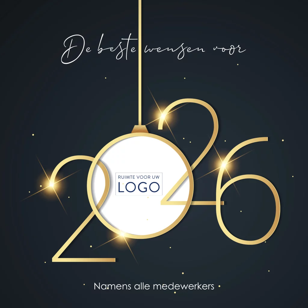 Omarm de kerstsfeer met onze prachtige blauwe kerstkaart. Het jaartal '2026' schittert in zowel grote als kleine cijfers, uitgevoerd in glanzend goud (geen foliedruk). Binnen de '0' van het jaartal kunt u tekst plaatsen en er is ruimte gereserveerd voor uw bedrijfslogo. Een perfecte manier om uw goede wensen over te brengen. Ervaar de mogelijkheden van personalisatie met onze gebruiksvriendelijke designtool en bekijk een voorproefje van het eindresultaat door een drukproef te bestellen.