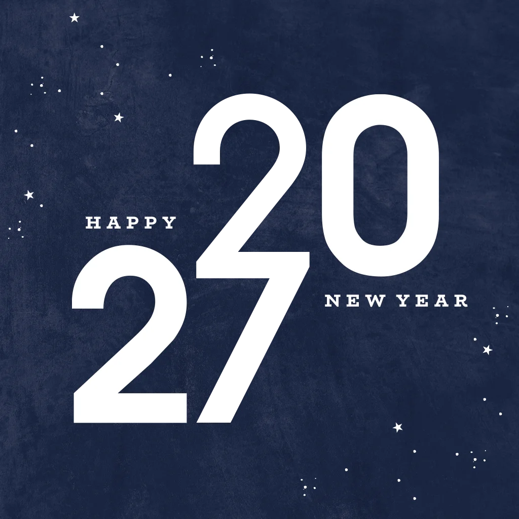 Donkerblauwe nieuwjaarskaart met 2027 in goudfolie