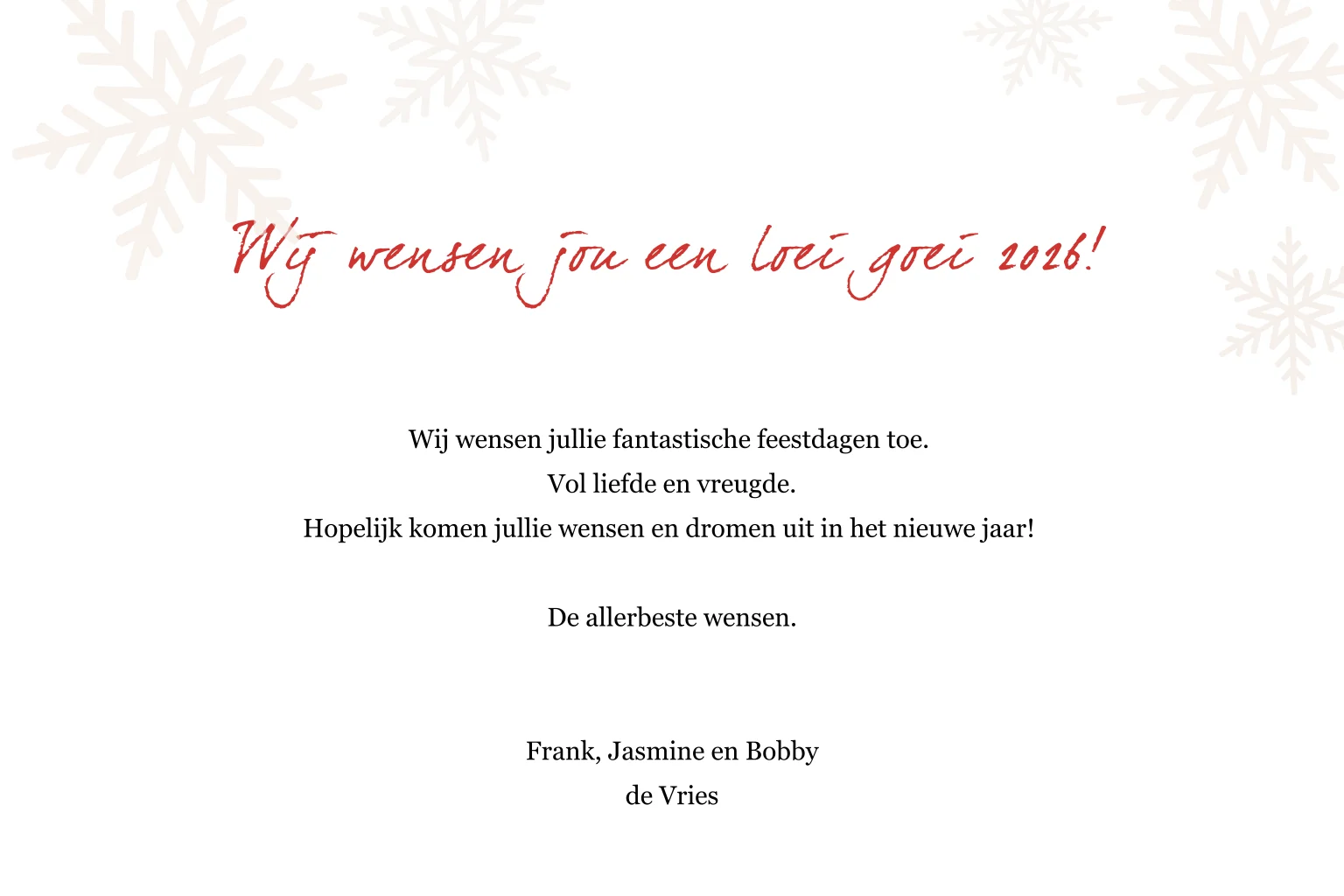 We wensen jou een loei goe(i) nieuwjaar! Met deze vrolijke kaart vol kerstkoeien en sneeuwvlokken stuur je een knipoog en een glimlach naar vrienden of familie. De grappige tekst en feestelijke kerstmutsen maken dit ontwerp perfect voor wie het nieuwe jaar met humor wil beginnen. Pas de namen eenvoudig aan in onze online editor.