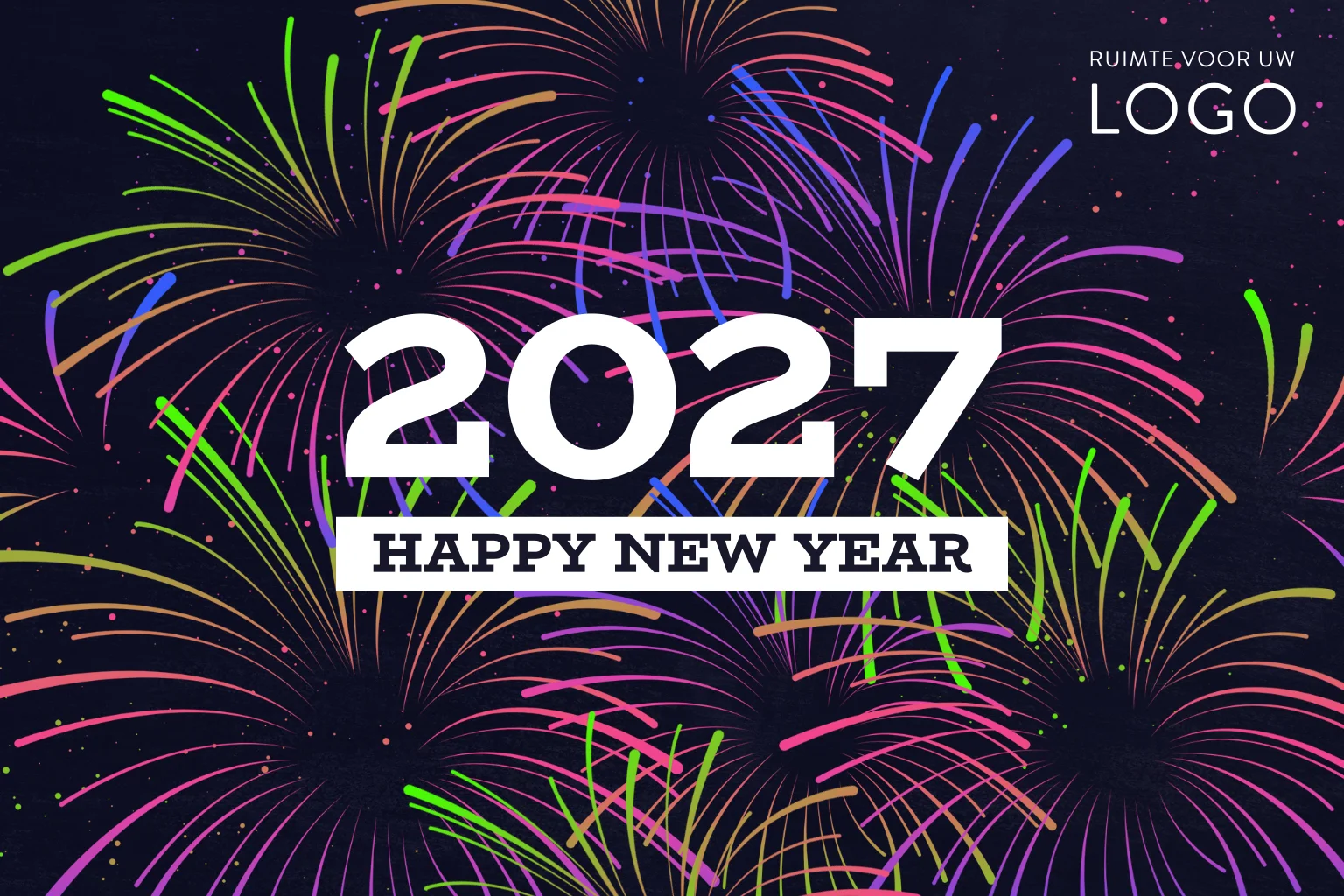 Op een sfeervolle, zwarte achtergrond stralen neonachtige vuurwerkexplosies in de nacht. In witte letters prijkt "2027 Happy New Year." Voeg uw bedrijfslogo toe in de hoek en maak deze nieuwjaarskaart van ons uw eigen. Bestel een drukproef om dit ontwerp eerst in het echt te zien. Verwelkom het nieuwe jaar in stijl.