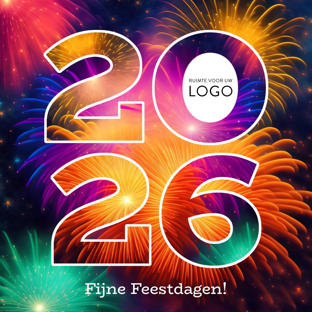 Onze prachtige kerstkaart is versierd met kleurrijk vuurwerk op de achtergrond. Op de voorkant prijkt het jaartal 2026, ook in vuurwerkstijl. De '0' van 2026 is wit en biedt ruimte om uw logo toe te voegen. Pas de kaart moeiteloos aan met onze editor en bestel een drukproef.