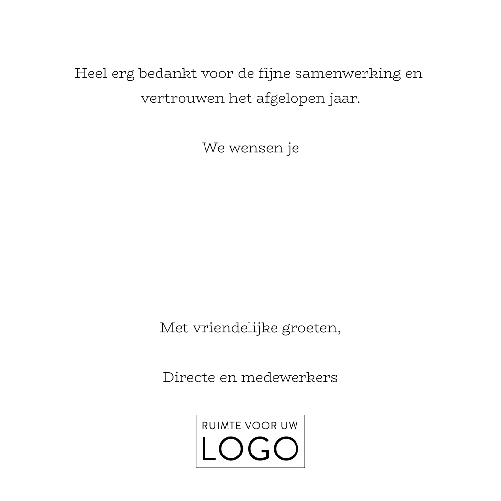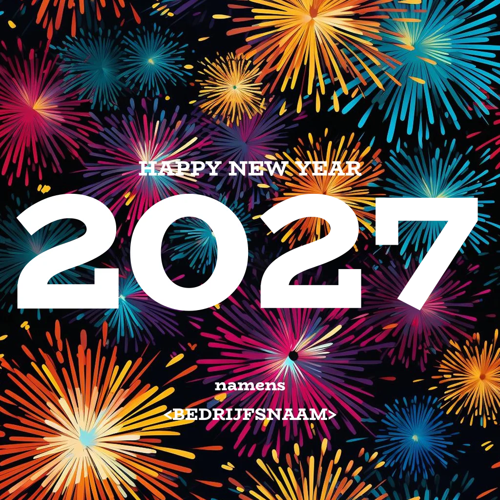 Stuur deze prachtige nieuwjaarskaart met een kleurrijk vuurwerk op de achtergrond naar al je zakelijke relaties. Op de voorkant prijkt het jaartal 2027, waarbij de '27' in schitterende goudfolie wordt gedrukt. Pas de kaart naar wens aan met onze handige editor.