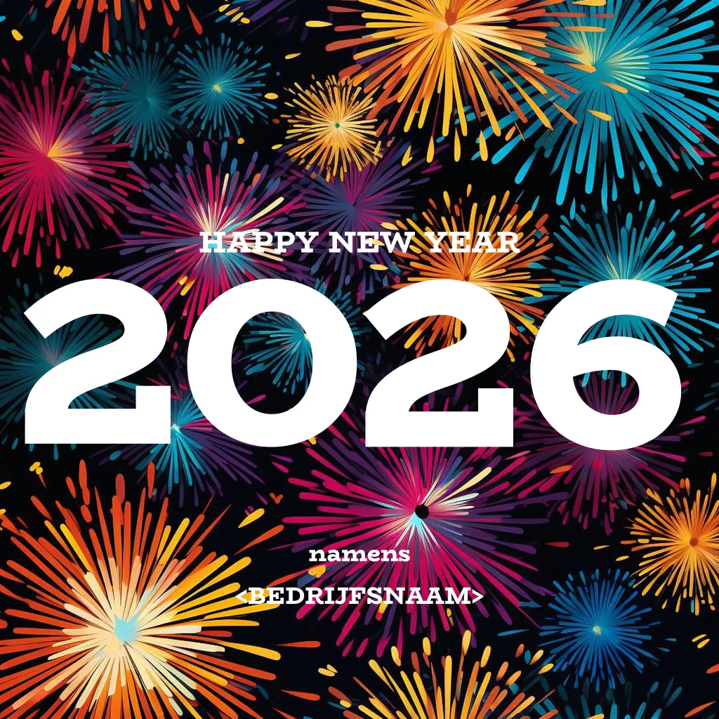 Stuur deze prachtige nieuwjaarskaart met een kleurrijk vuurwerk op de achtergrond naar al je zakelijke relaties. Op de voorkant prijkt het jaartal 2026, waarbij de '26' in schitterende goudfolie wordt gedrukt. Pas de kaart naar wens aan met onze handige editor.