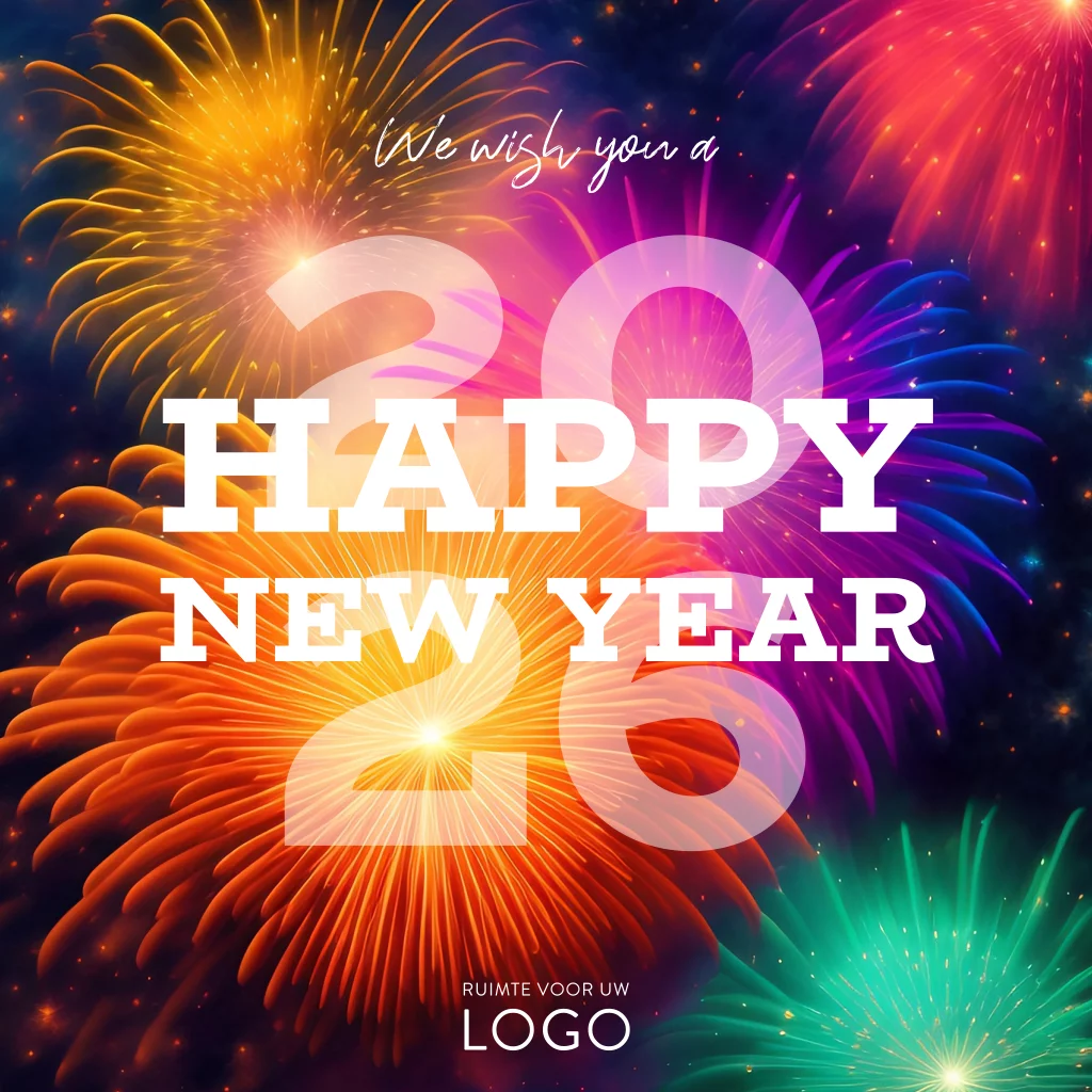 Vrolijke kerstkaart die straalt in prachtig regenboogvuurwerk. Het prominente 'Happy New Year' in wit springt eruit. In transparant wit staat het jaartal 2026 op de achtergrond. Pas de kaart naar wens aan met de editor.