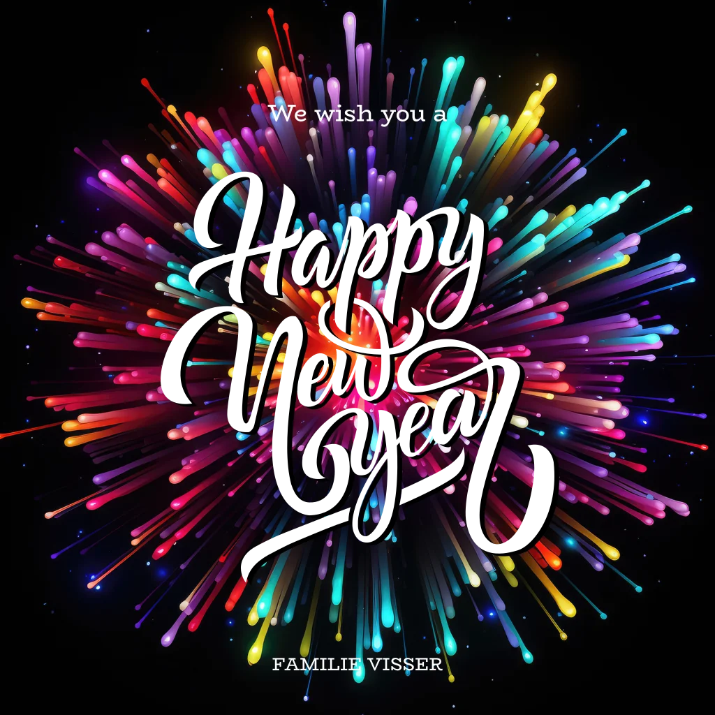 Vier het nieuwe jaar met deze feestelijke nieuwjaarskaart vol kleurrijk vuurwerk. De tekst Happy New Year straalt in goudfolie in een hippe typografie. Personaliseer de kaart eenvoudig in onze designtool en bestel een drukproef.