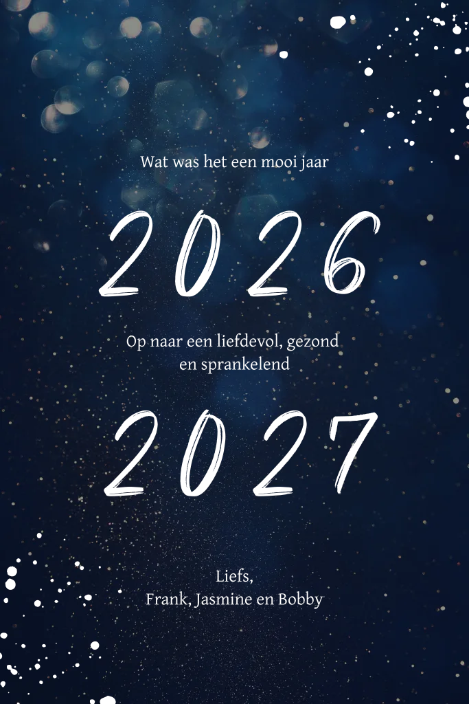 Sluit het jaar in stijl af met deze donkerblauwe nieuwjaarskaart met goudfolie. De sprankelende details en warme tekst maken deze kaart perfect om vrienden en familie een liefdevol, gezond en stralend 2027 te wensen. Personaliseer eenvoudig met jullie eigen namen of boodschap in de online editor.