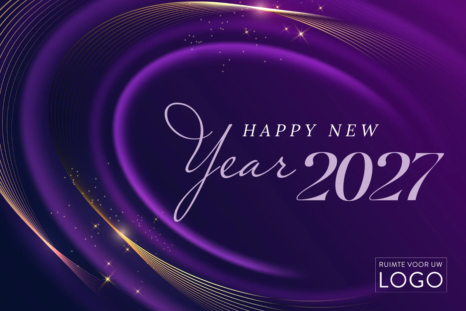 Deze zakelijke nieuwjaarskaart heeft een stijlvolle, paarse achtergrond met subtiele gouden accenten en een golvend dynamisch design. De boodschap "Happy New Year 2027" staat centraal en kan eenvoudig worden aangepast in de editor naar uw eigen wensen. Onderaan de kaart is ruimte voor het toevoegen van uw bedrijfslogo. Ideaal voor bedrijven die hun relaties een succesvol en gelukkig nieuwjaar willen toewensen.