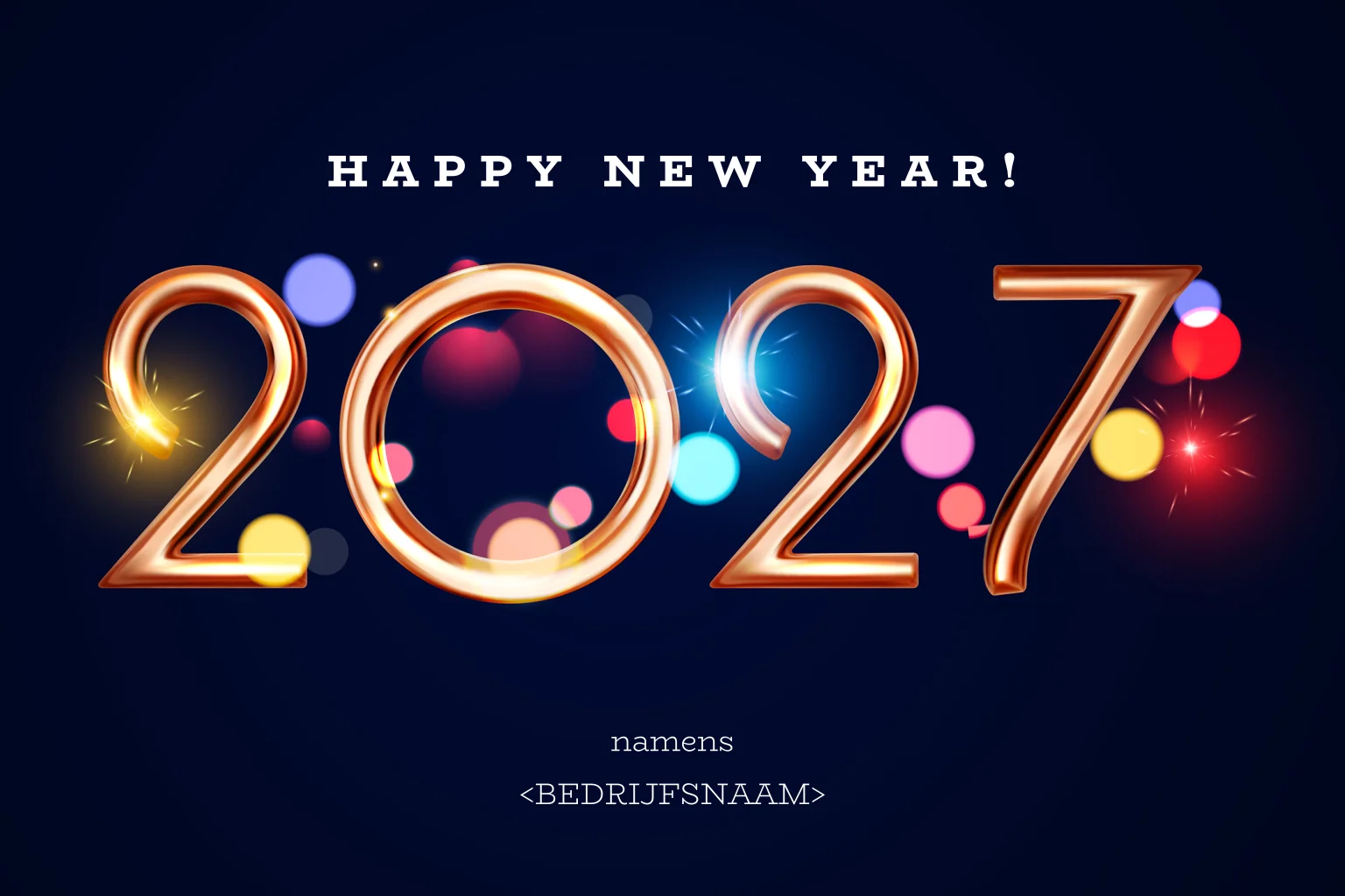 Zwarte nieuwjaarskaart met groot 2027 in goudkleur. Erachter gekleurde lichtbollen. De teksten kun je eenvoudig met de editor aanpassen.
