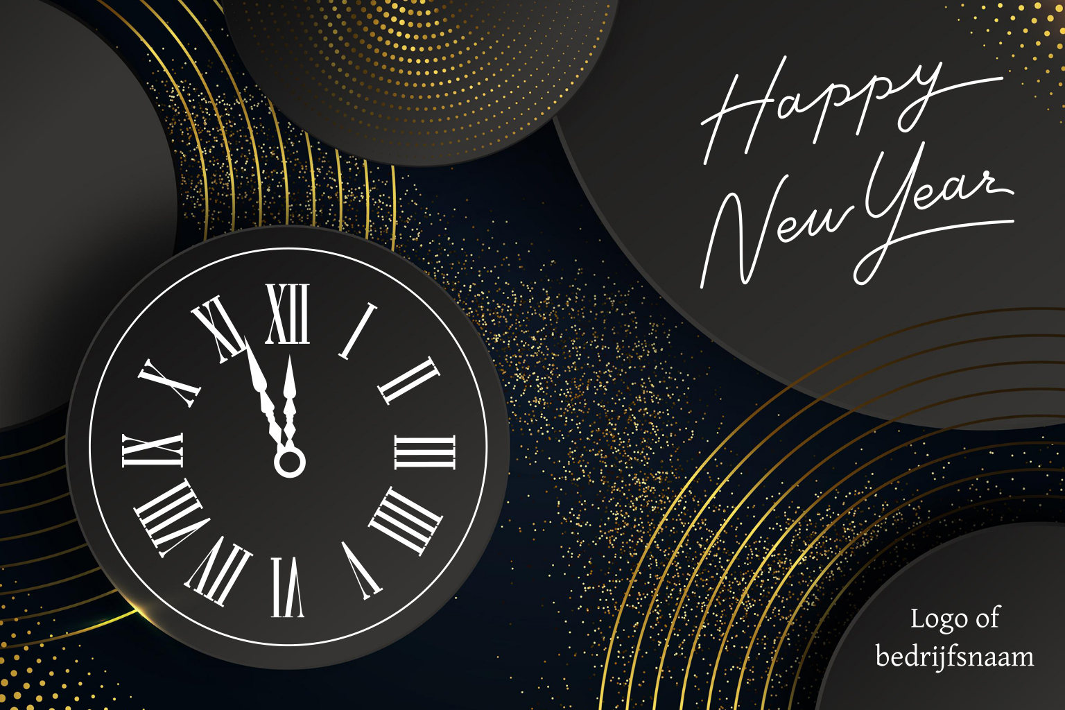Op zoek naar een feestelijk nieuwjaarsstatement voor jouw bedrijf? Zoek niet verder! Deze chique zwarte nieuwjaarskaart is prachtig met zijn elegante cirkels, inclusief een klok die vijf voor twaalf aangeeft. De goudfolie knalt van het design met de tekst 'Happy New Year'. Er is zelfs ruimte voor jouw bedrijfsnaam of logo. Laat jouw merk stralen terwijl we samen het nieuwe jaar vol enthousiasme tegemoet gaan!