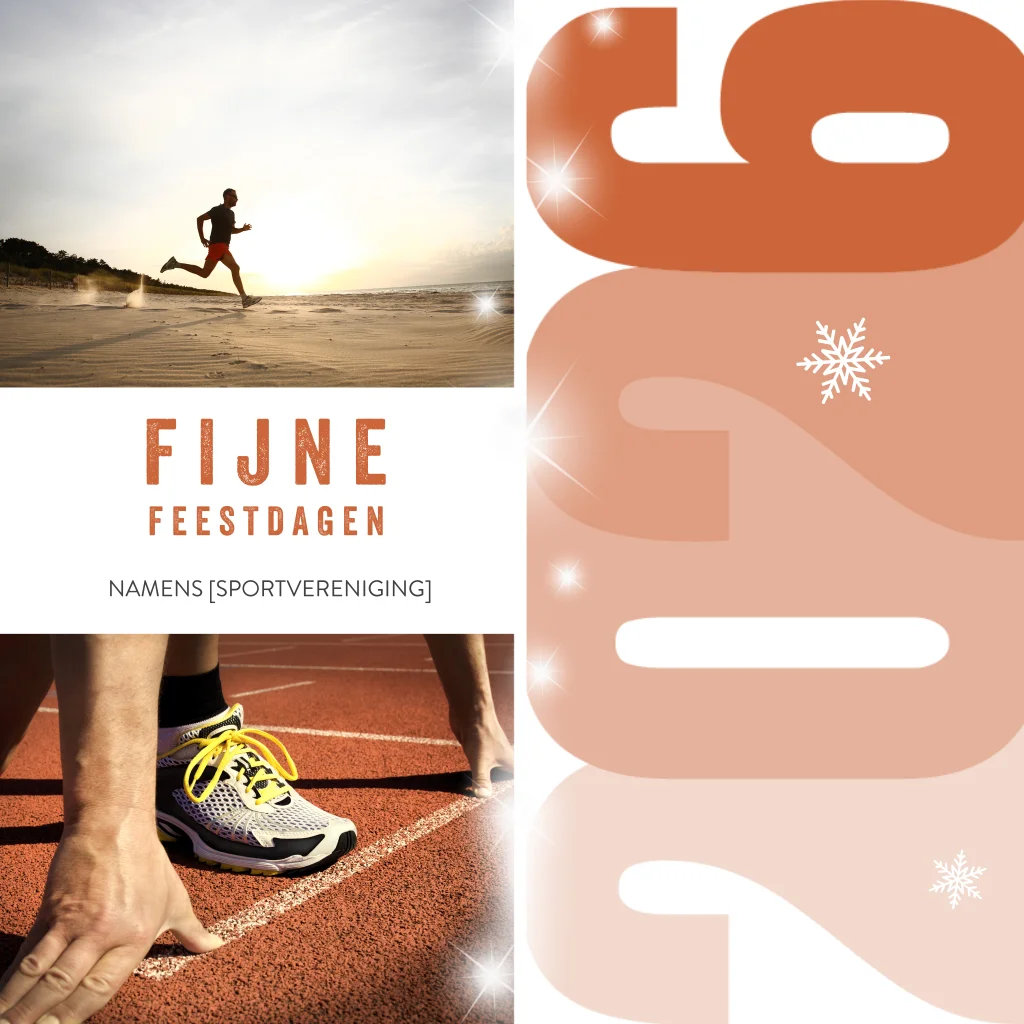 Mooie, dubbele kerstkaart met verschillende vlakken en foto's die te maken hebben met sport. Links kun je de bedrijfsnaam plaatsen. Het jaartal 2026 is met grote, bruine cijfers op de kaart geplaatst. De foto's, lettertypes en kleuren kan je naar wens aanpassen.