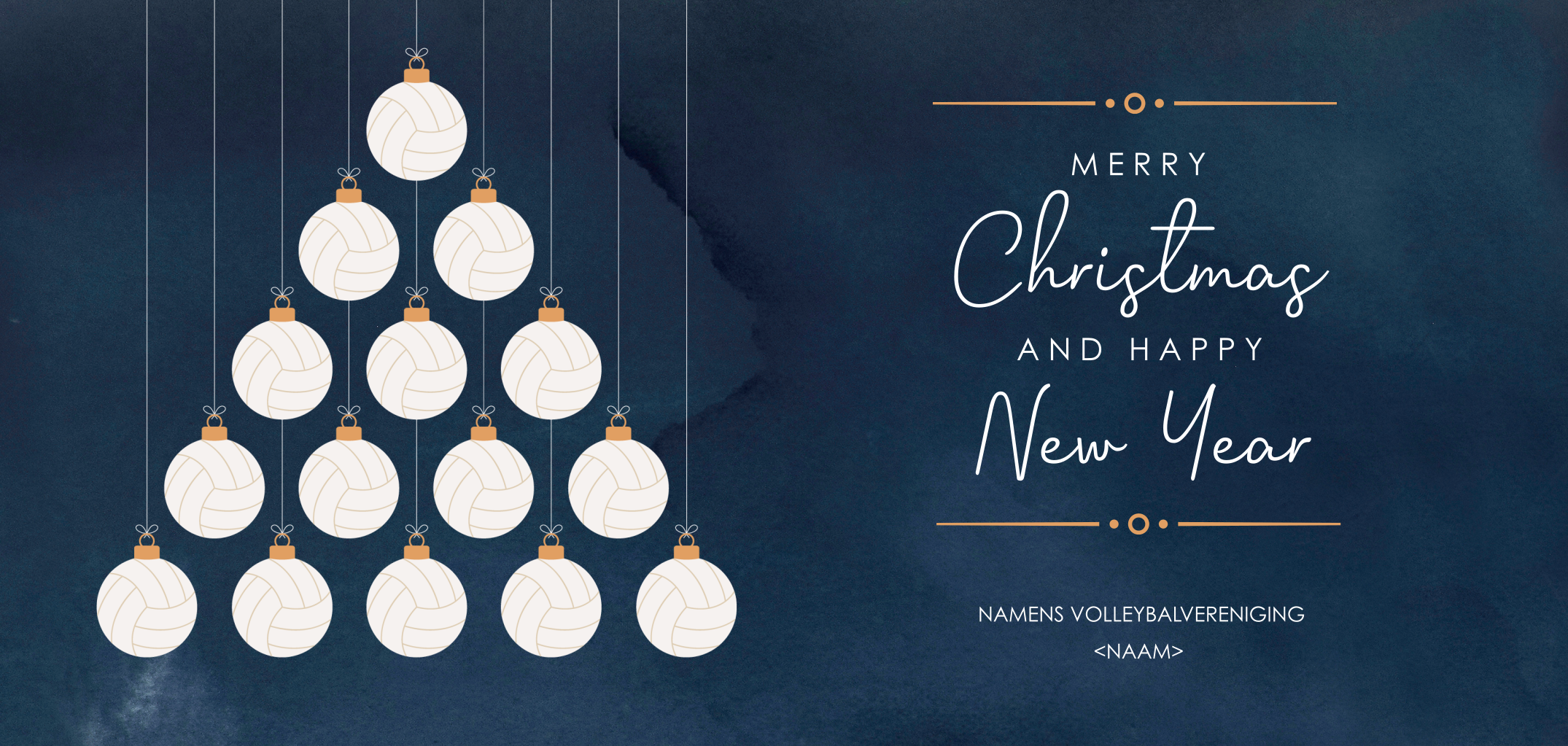 Stuur alle leden en vrijwilligers van uw volleybal vereniging deze toepasselijke kerstkaart met hangende volleyballen om ze te bedenken voor hun inzet het afgelopen jaar. De afgeronde hoeken geven de kaart een mooie, finishing touch.