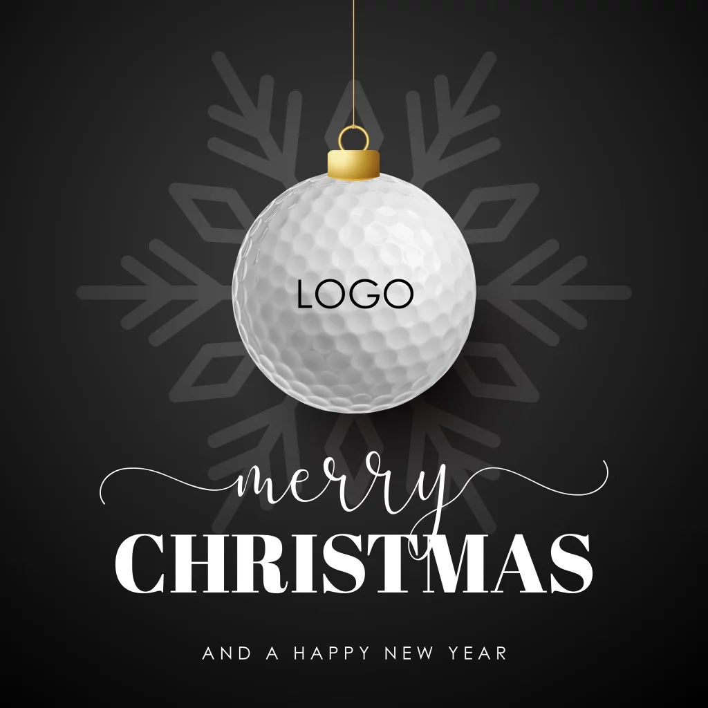 Toepasselijke kerstkaart om namens een golfvereniging te sturen. Voorop een foto van een golfbal als kerstbal op een diepzwarte achtergrond. Op verzoek zetten wij uw verenigingslogo op de golfbal. Mooie typografie met goudfolie.