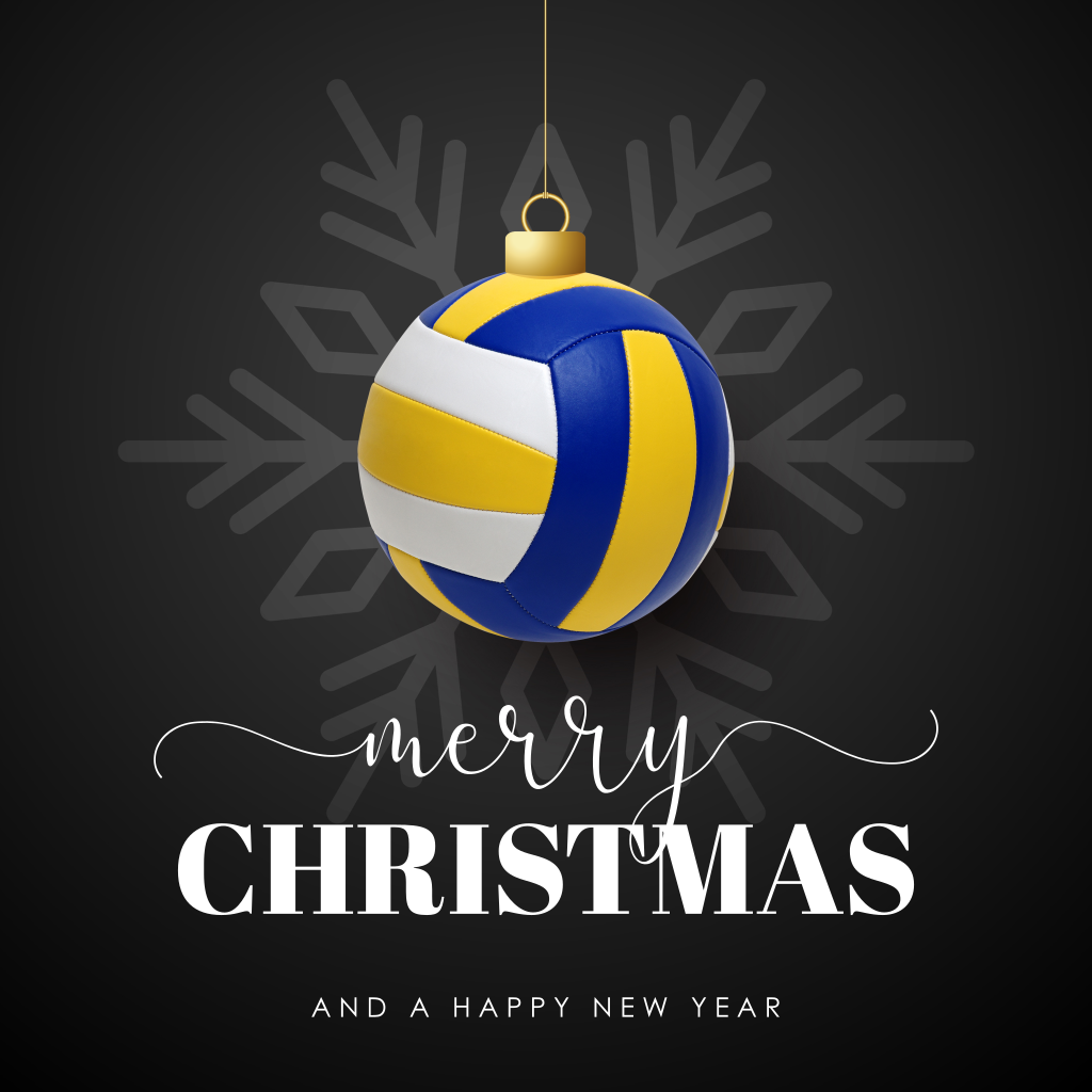 Toepasselijke kerstkaart om namens een volleybalvereniging te sturen. Voorop een foto van een volleybal als kerstbal op een diepzwarte achtergrond. Mooie typografie met goudfolie.