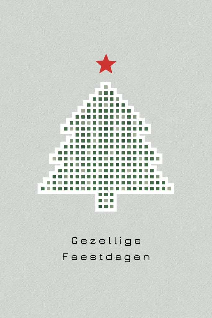 Strakke kerstkaart met een moderne kerstboom van groene pixels en een rode ster. Simpel, fris en eigentijds — perfect voor wie houdt van een clean design met een feestelijke knipoog. Voeg een persoonlijke boodschap toe en maak de kaart helemaal af.